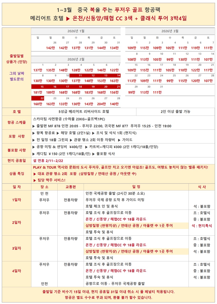 [푸저우] 2월 초가을 쾌청한 날씨 골프관광 / 5성급호텔 스테이