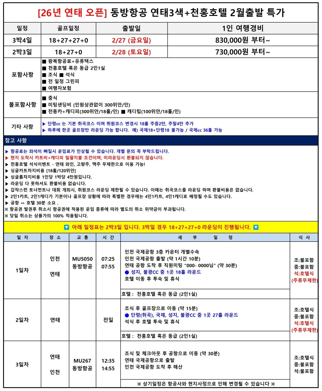 [연태 삼일절] 연태 3색골프 + 천홍호텔 2박/3박 이벤트 패키지