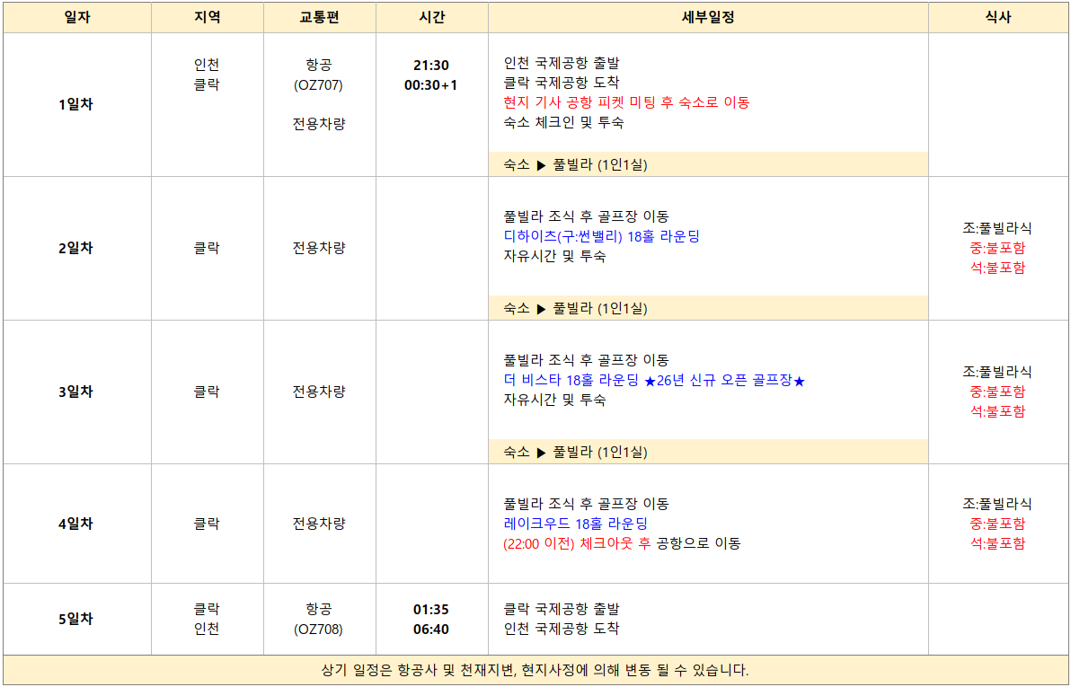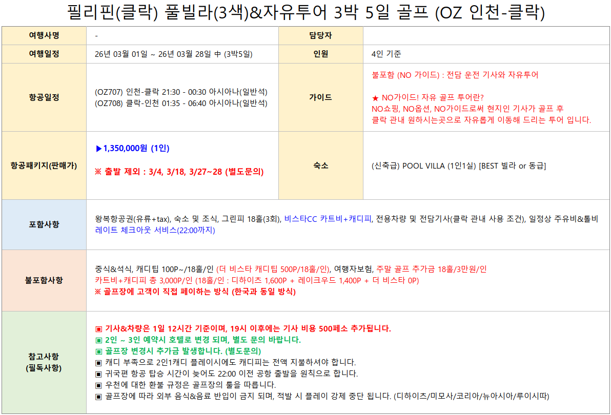 [클락 3월출발] 아시아나항공 - 풀빌라 3색골프 + 자유관광 3박5일 패키지