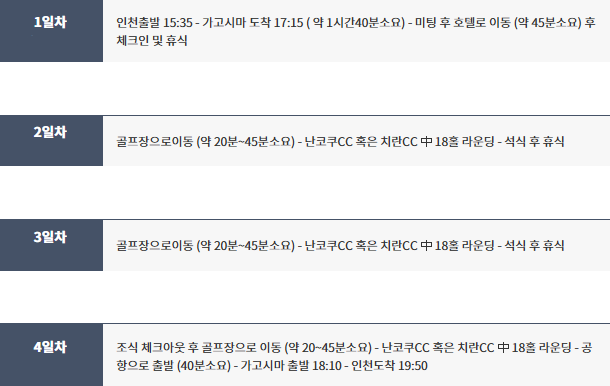 | ★ 한국에서 1시간30분 비행거리 ~!! ★ 시내 숙박 ! 다양한 맛집 투어 가능! ★ 사쿠라지마 화산섬 뷰 감상! ★ 2색으로 즐기는 실속 골프!! [견적문의] 궁금하신 사항 다른상품도 가능 조인/팀 편하게 물어보셔도 됩니다 골프몬 최팀장010-4760-0469 오픈채팅으로도 문의 주세요 https://open.kakao.com/o/syGEbl8h | ||||||||
