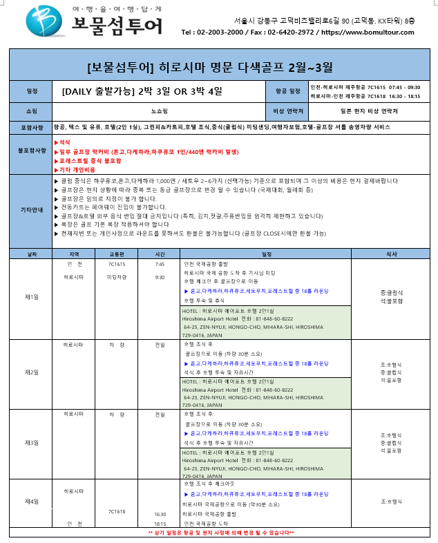 ▶ 기타 유의 사항 - 골프 라운딩은 골프장 폐장 30분 전까지만 가능/ 첫날 항공 지연등으로 18홀 라운드 불가 시 환불 불가 - 마지막 날 조식은 현지 사정에 따라 호텔 조식이 도시락으로 대체될 수 있사오니, 양해 부탁드립니다.