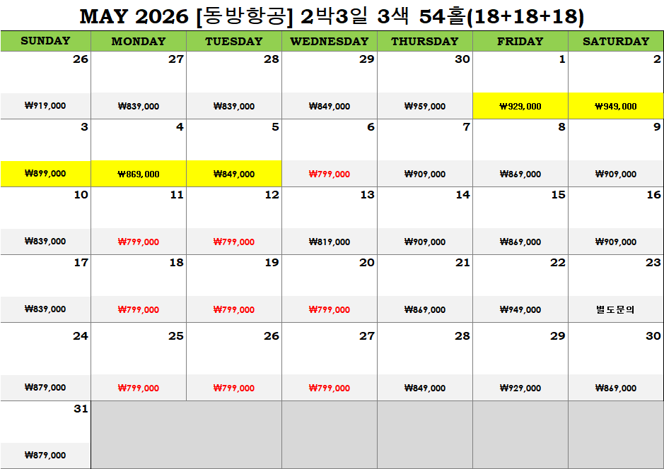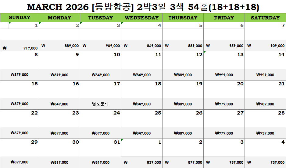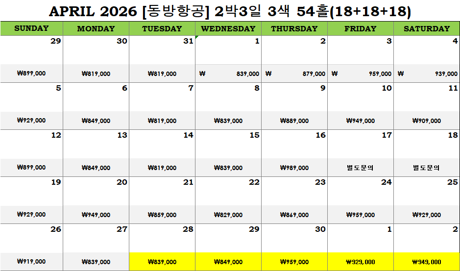 2박 3일 일정 [조/석 라운딩 3회 54홀]