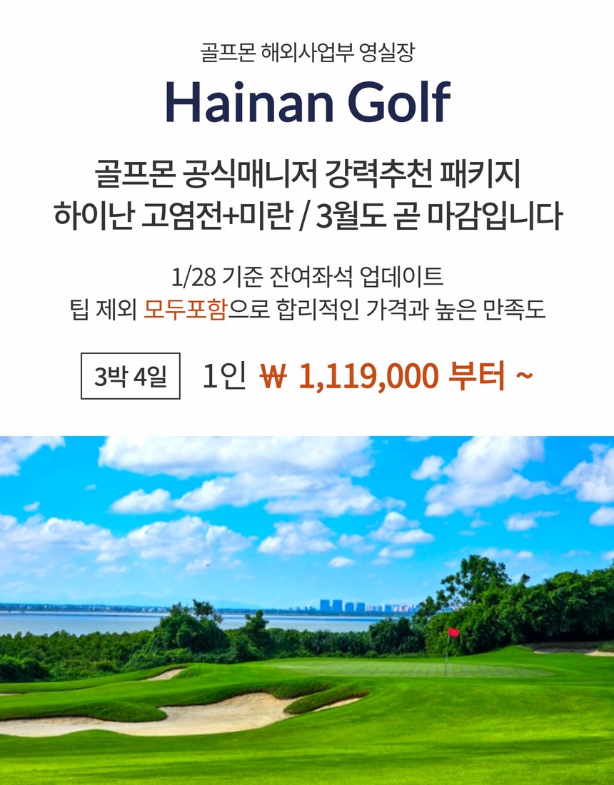 [하이난 미란·고염전] 1/28 기준 잔여좌석 업데이트 - 골프몬 공식매니저 강력추천 패키지
