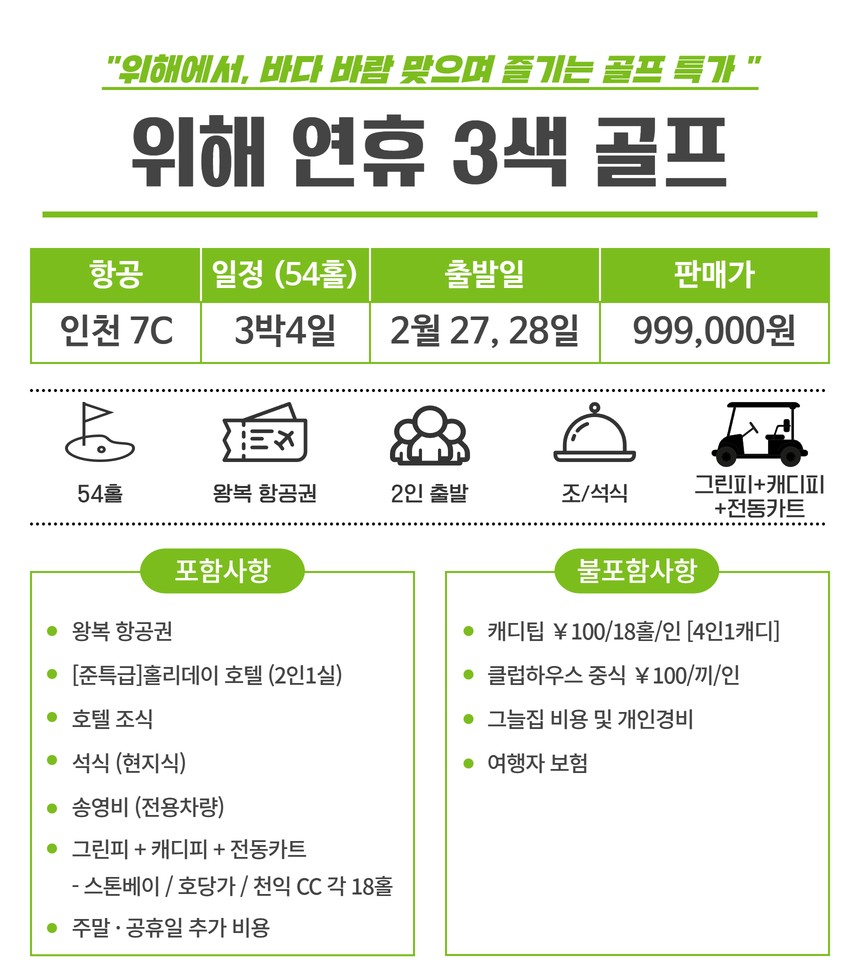 [위해] 2월 마지막 연휴 특가 3색 골프 4일 54홀_ 02/27.28일 출발