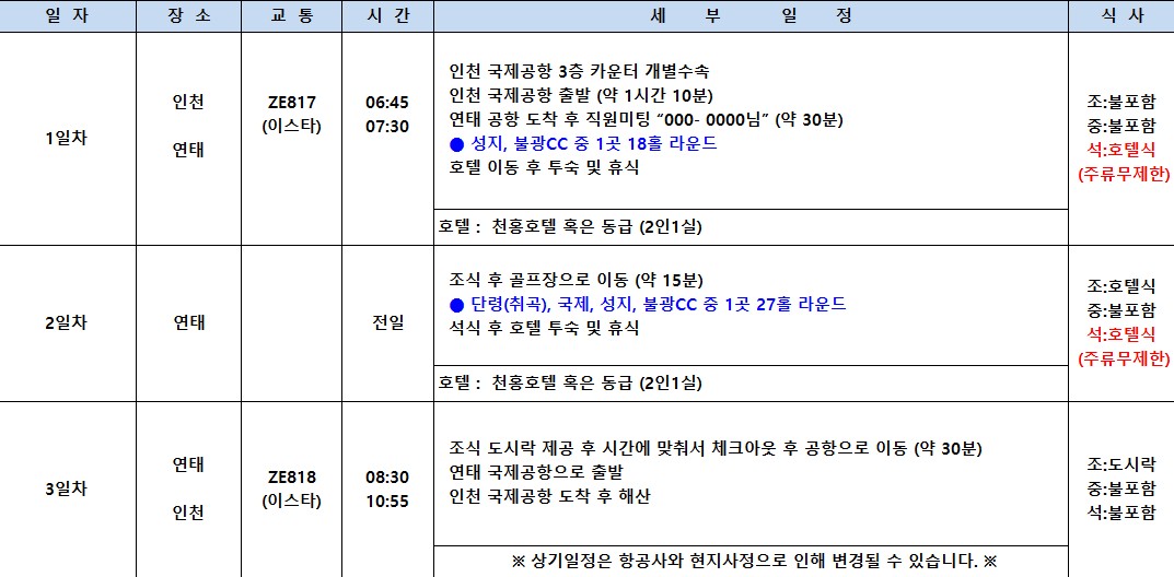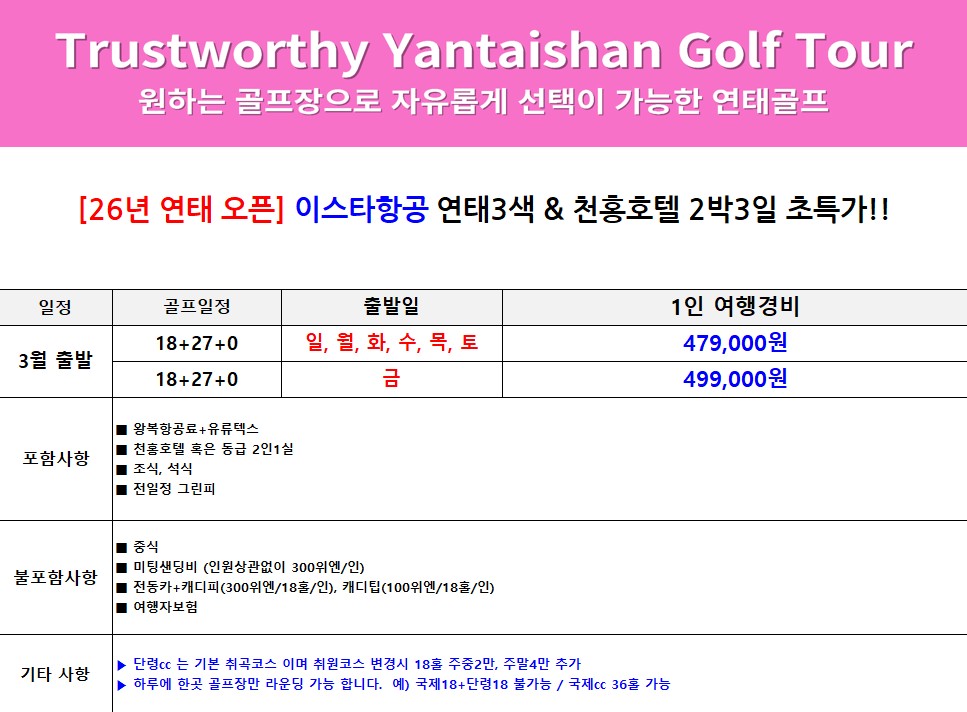 [연태 시내] 3색골프 / 이스타항공 - 주류무제한 2박3일 특가패키지