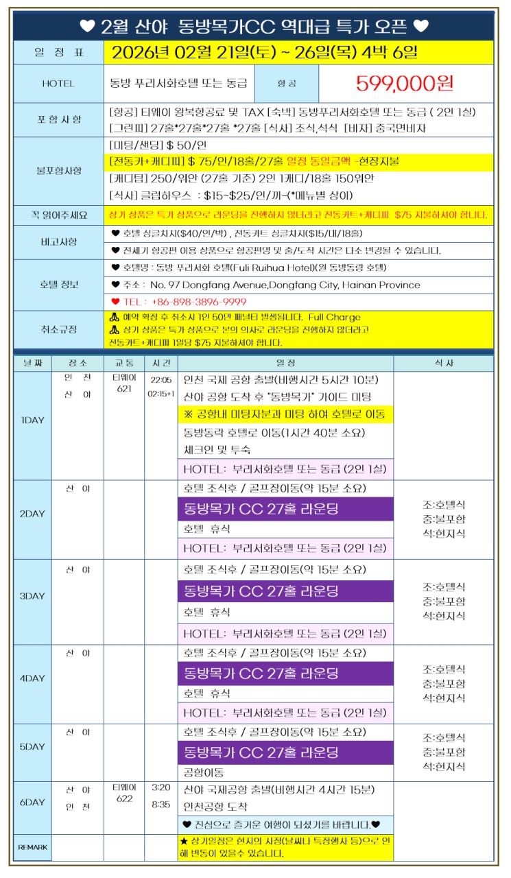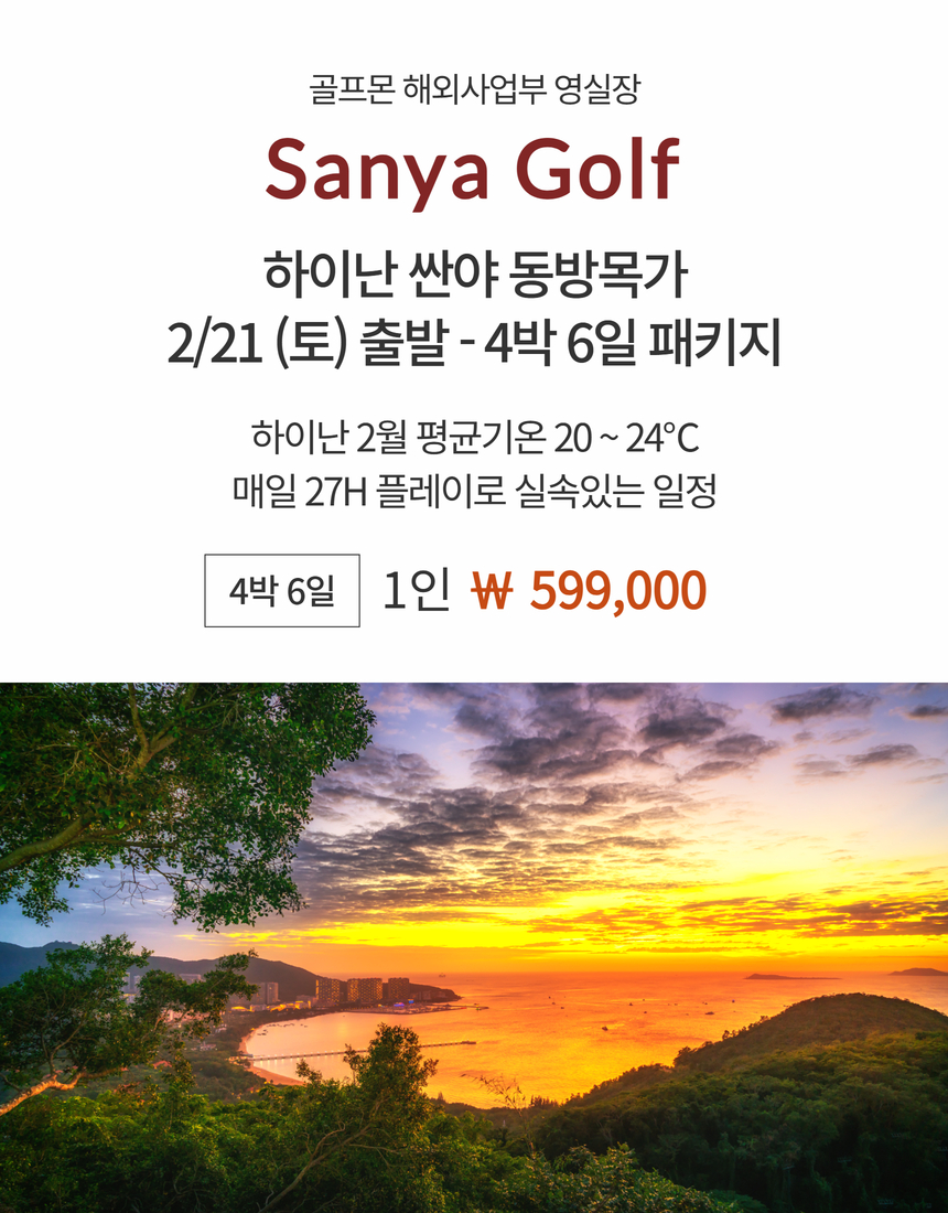 [하이난 싼야] 2/21(토) 출발 동방목가 4박6일 패키지 - 매일 27H 플레이
