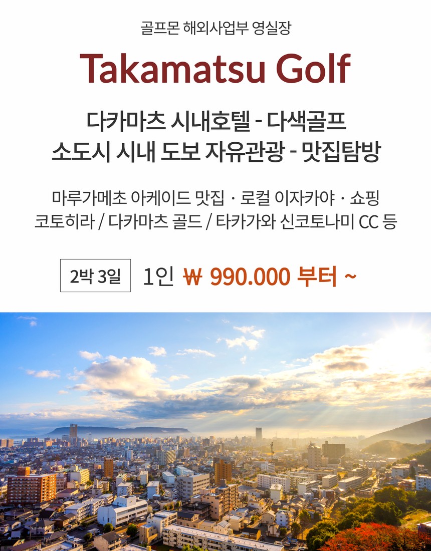 [다카마츠 시내] 마루가메초 시내에 위치한 호텔 - 소도시 도보 자유관광 + 다색골프 2박/3박