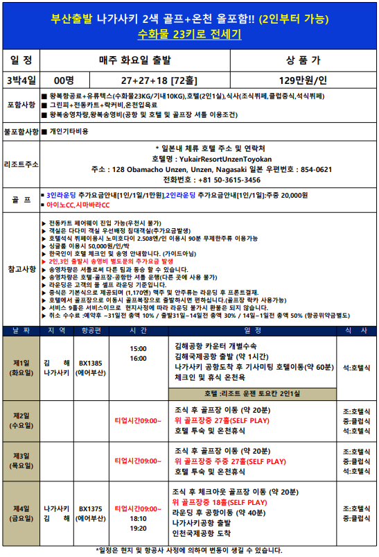 | ⭕ 포함사항 | 에어부산항공(무료수화물23키로,기내10키로) 운젠 토요칸 호텔 2인1실(다다미 객실) 조식(뷔페) ,중식(클럽식),석식(뷔페),온천입욕료 그린피 + 카트비 + 락카비 공항-호텔-골프장 송영비