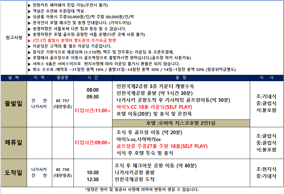 | 🧳 출발일&금액 | 대한항공 이용 시내 온천호텔 이용 (오션뷰) 중급이상의 골프장 라운드 나가사키 품격골프