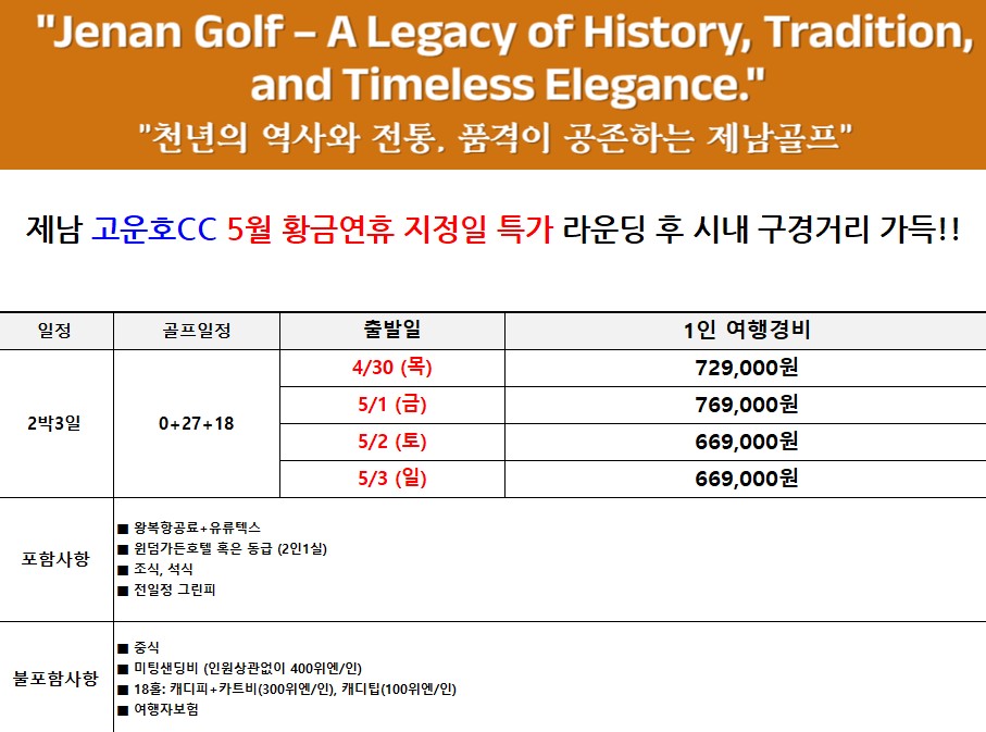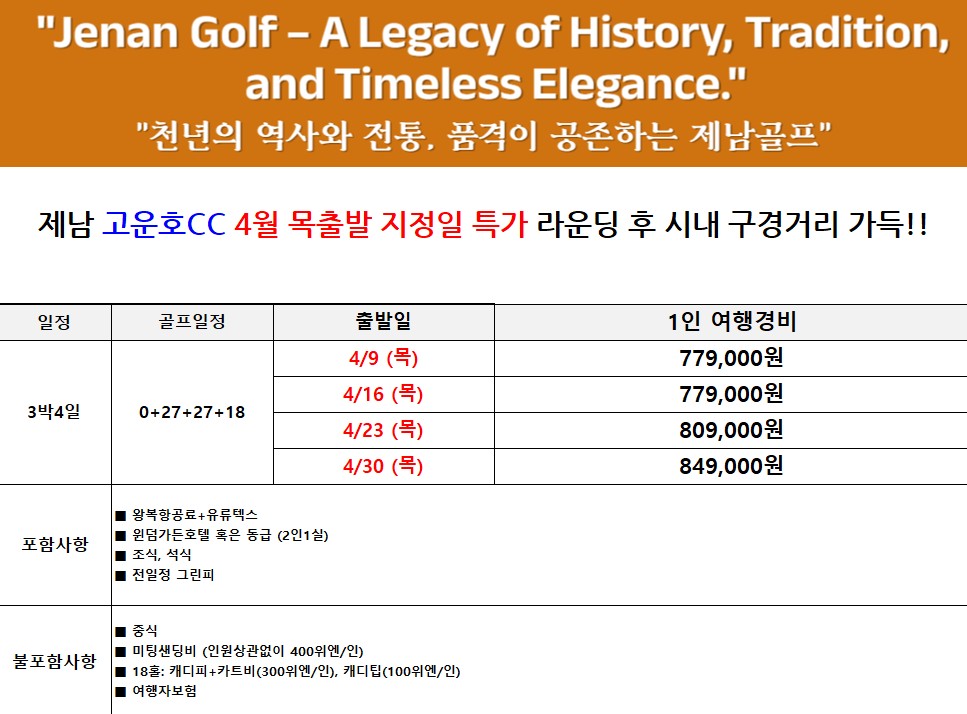 | 여행의 피로마저 녹여낼 최신식 5성급 윈덤가든 호텔의 럭셔리함 길에서 버리는 시간 없이, 오직 골프와 휴식에만 집중 골퍼라면 꼭 가봐야 할 중국 100대 명문 골프장의 클래스 제남의 랜드마크 인상제남&천세계에서 즐기는 여유로운 관광 언어 걱정 NO! 한국어 능통 스태프