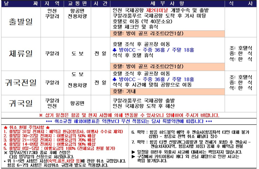 💎 5성급 럭셔리 리조트 내 골프장에서 🎒 옵션 관광 프로그램 🚌 시티투어: USD 80 (왕궁, 쌍둥이빌딩, 차이나타운, 잘란알로 야시장 / 8인 기준) 🚌 겐팅하일랜드: USD 100 (바투동굴, 겐팅 카지노 등 / 8인 기준) 🚌 말라카 유적지 투어: USD 130 (수상 모스크, 크라이스트처치 등 / 8인 기준) 🚌 반딧불 투어: USD 120 (몽키힐, 반딧불 체험 등 / 8인 기준) ※ 식사 및 입장료 포함 🏌️♂️ 방이 골프 리조트 (Bangi Golf Club) Donald W. Fream이 설계한 방이 골프장은 쿠알라룸푸르 인근에서 유일하게 도심권 골프와 자연지형이 절묘하게 어우러진 27홀 명문 골프장입니다. 방이9, 푸트라자야9, 가장9로 구성되어 있으며, 각 코스마다 고저차가 큰 페어웨이, 전장 곳곳의 해저드, 깊은 호수와 자연 숲이 어우러져 전략적인 플레이를 유도합니다. 전동카는 우천 시를 제외하고 페어웨이 진입이 가능하며, 완벽한 배수시설로 인해 날씨 영향도 적습니다. 현지 교민과 말레이시아 현지 골퍼, 일본·유럽 투어 고객에게도 인기가 높으며, 접근성, 코스의 수준, 자연경관까지 모두 갖춘 리조트형 골프장의 표본이라 할 수 있습니다. 🏨 방이 리조트 호텔 (Bangi Resort Hotel) 골프장 내에 위치한 5성급 방이 리조트 호텔은 쿠알라룸푸르 국제공항 및 시내에서 차량 약 30분 거리로, 장기 투숙에 최적화된 고품격 호텔입니다. 다수의 항공사 승무원들이 연중 장기 체류하는 검증된 서비스 품질을 자랑합니다. 넓은 객실 전면에는 골프장 또는 야외 수영장이 보이는 발코니가 마련되어 있으며, 무료 Wi-Fi, 유료 룸서비스, 세탁 서비스 등이 제공되어 장박 고객에게 최적화된 환경을 제공합니다. 수영장, 사우나, 피트니스센터, 편의점, 일식당, 중식당, 라운지 바 등 다양한 부대시설도 이용 가능하며, 차량 15분 거리에는 IOI CITY MALL이 위치해 있어 골프 외에도 여유로운 쇼핑과 휴식이 가능합니다. #동남아골프 | ||||||||