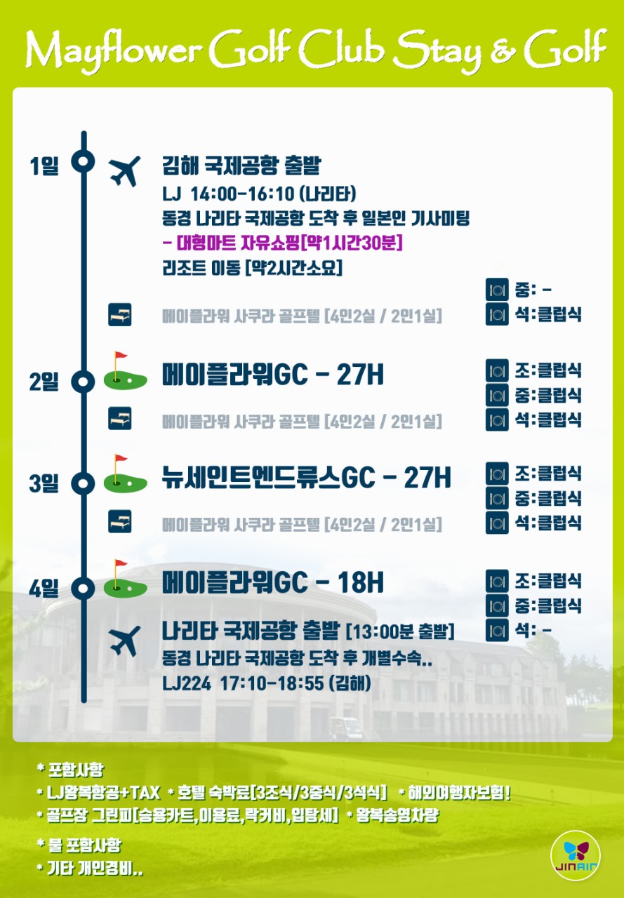 부산-나리타 LJ223 14:00-16:10 나리타-부산 LJ224 17:10-18:55 | ⭕ 포함사항 | LJ왕복항공+TAX 항공수하물+골프백[20Kg] 그린피+카트비+락커피 포함 일정상의[조.중.석] 해외여행자보험 왕복송영차량