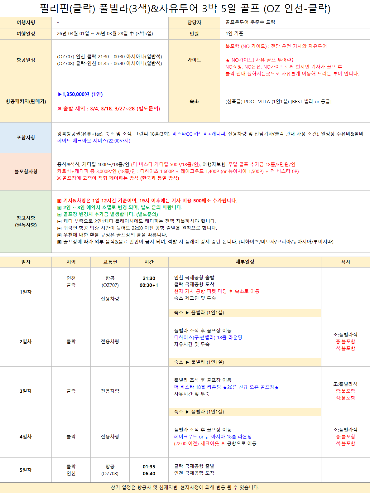 | 🧳 출발일&금액 | 3/1 ~ 3/28 출발 ▶ 1인 1,350,000원 (3박5일) ※ 출발 제외 : 3/4, 3/18, 3/27~28 (별도문의) ※ 주말 골프 추가금 18홀/3만원/인