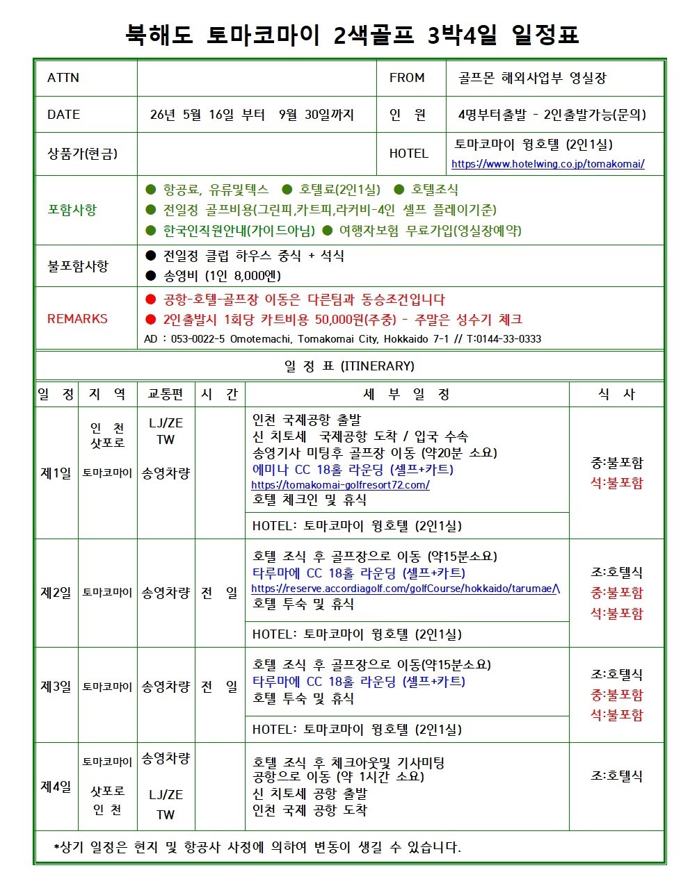 | 🚩 기타안내 | - 송영차량은 타 팀과 동승할 수 있습니다. - 실시간 최저가 항공기준으로 견적 드립니다. - 공항에서 에미나CC 약 20분 소요 - 호텔에서 골프장까지 약 15분 소요