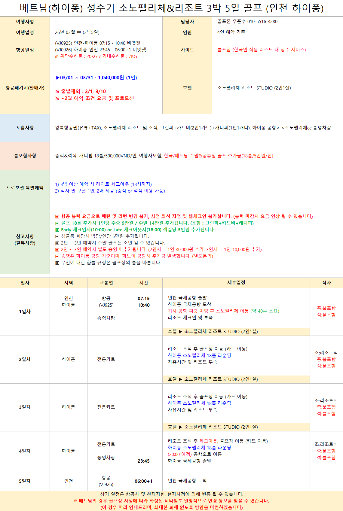 | 🚩 기타안내 | 골프 9홀 또는 18홀 추가 가능합니다. (추가금 별도 문의) 리조트 얼리 체크인 또는 레이크 체크아웃 가능합니다. (추가금 별도 문의) 2인 ~ 3인 예약시 주말 골프는 조인 될 수 있습니다. 2인 ~ 3인 예약시 별도 송영비 추가됩니다. 송영은 하이퐁 공항 기준이며, 하노이 공항시 추가금 발생합니다. (별도 문의) 우천에 대한 환불 규정은 골프장의 룰을 따릅니다.