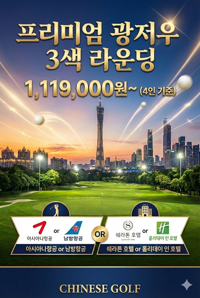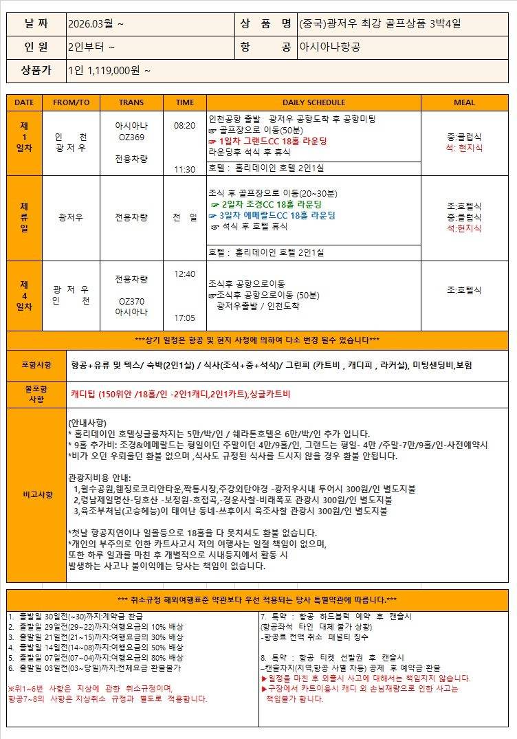 | 🚩 기타안내 | - 4인출발 기준으로 책정된 상품가입니다. - 실시간 항공권 기준 상품가입니다 (변동가능) - 홀리데이인 싱글룸 5만원/박 - 쉐라톤 싱글룸 6만원/박 - 식사 및 골프 진행안하셔도 별도환불 없습니다. - 관광옵션 사전예약 필수 - 1일차 항공지연이나 일몰 등으로 18H 플레이 다 못하셔도 별도환불 불가합니다. - 9H 추가금 ▶ 4만원/1인 - 그랜드레이크만 9H 추가금 평일 4만원/주말 7만원