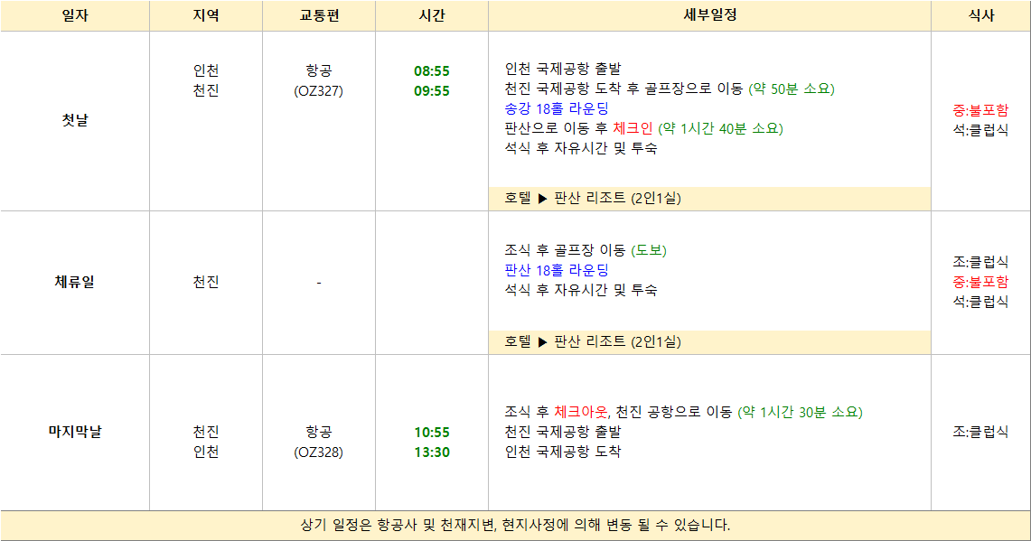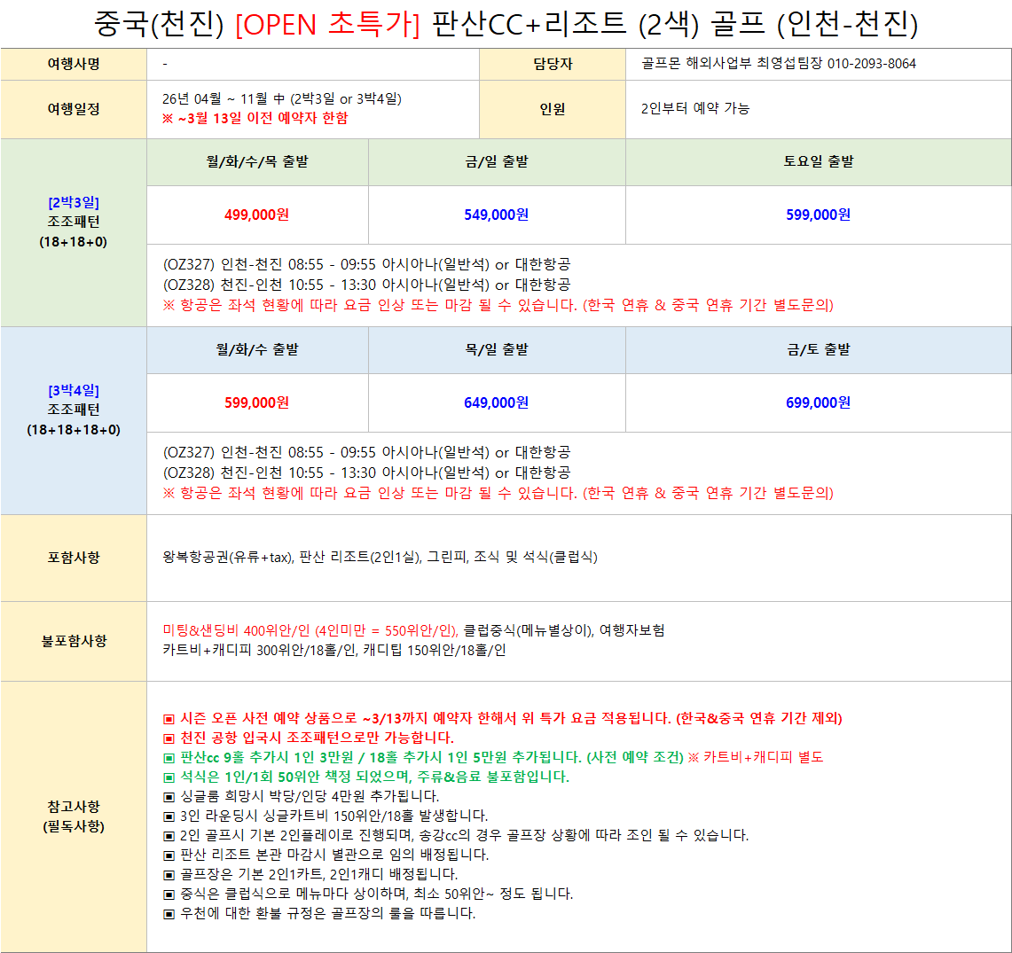 | 중국(천진) [26년 OPEN 특가] 판산CC+리조트 (2색) 골프 패키지 시즌 오픈 사전 예약 초특가 (~3/13 이전 예약자 적용) 26년 4월 ~ 11월 中 2박3일 or 3박4일 일정 (연휴 기간 제외) 천진 명품 골프장 판산CC & 송강CC 2색 라운딩 인천 공항 ↔ 천진 공항 인/아웃 2인부터 예약 가능 천진 판산CC & 송강CC (2색) 라운딩 ※ 시즌 오픈 사전 예약 상품 ~3/13 까지 예약자 한함 (한국&중국 연휴 기간 별도 문의) | ||||||||