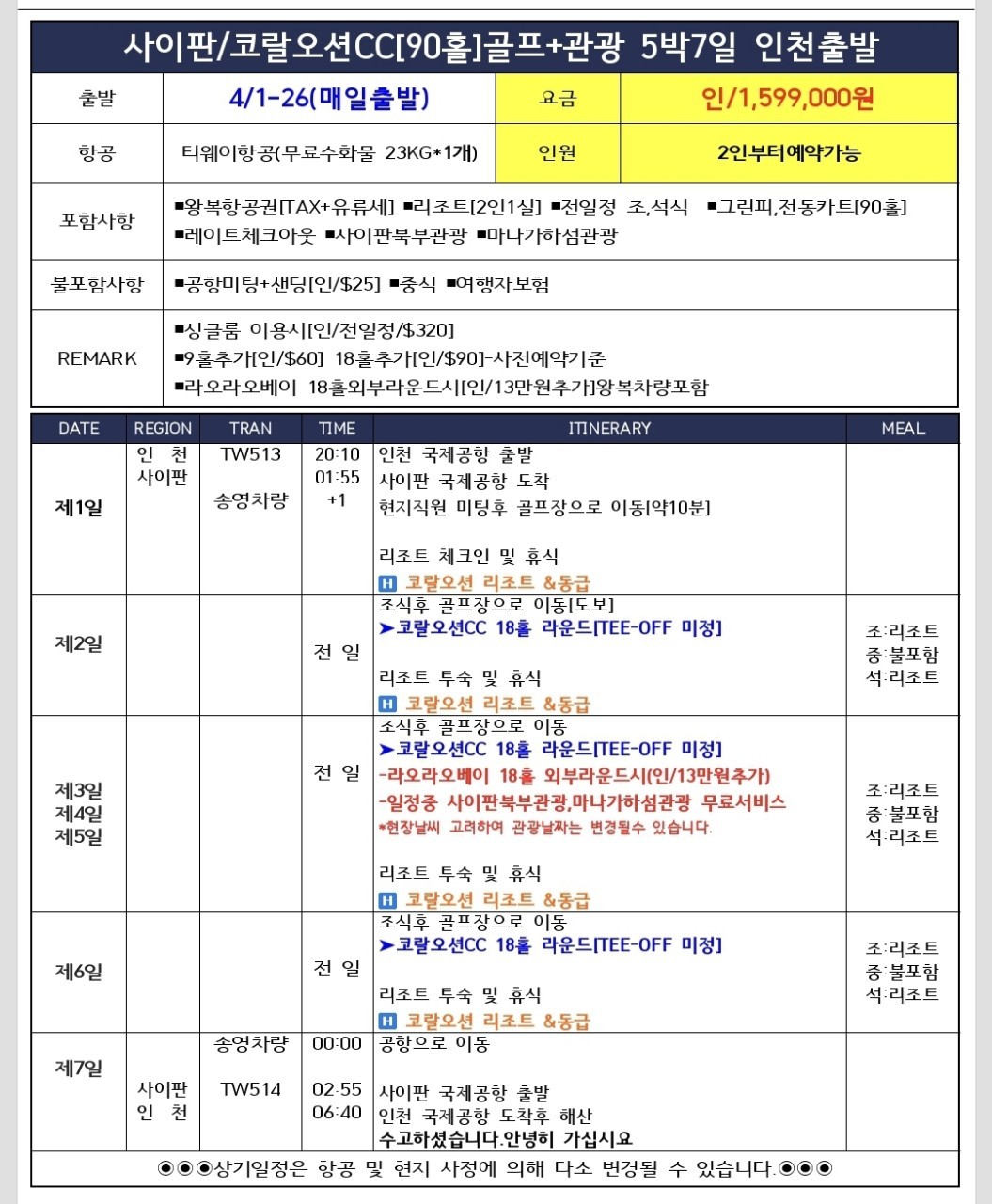 [사이판] 4월 매일출발 (5박7일) 코랄오션 리조트 - 사이판북부 + 마나가하섬 무료관광 서비스 제공