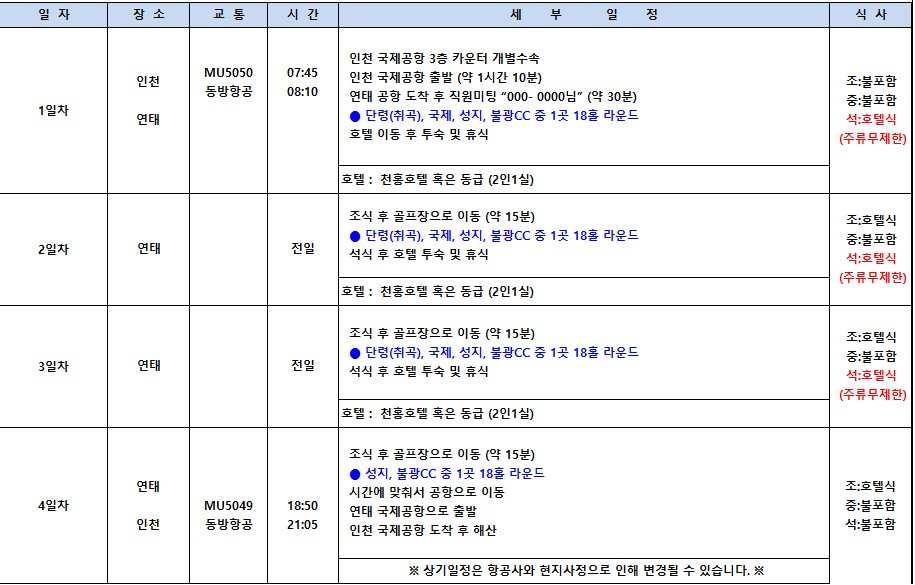 [연태] 5/1일출발 3색골프 2인부터(주류무제한) 3박4일 총 72홀