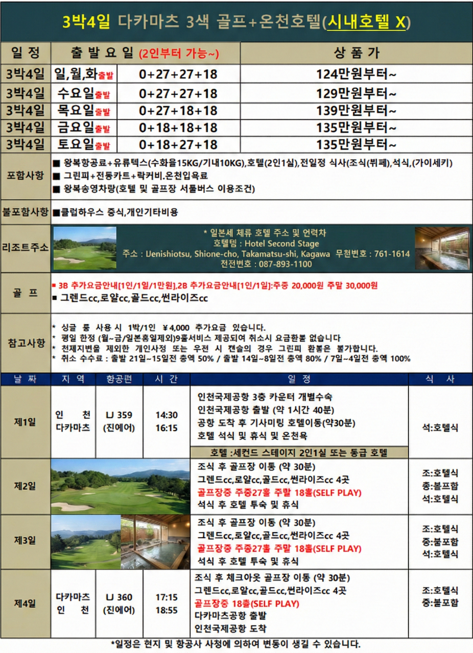 | 🧳 출발일&금액 | 2인부터 가능(추가송영비없음) 다카마츠 3색골프