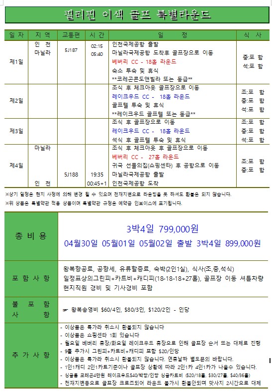 [마닐라] 이색골프 파격특가 - 캐카비 모두포함 3박4일 패키지 / 베버리·레이크우드 81H 플레이