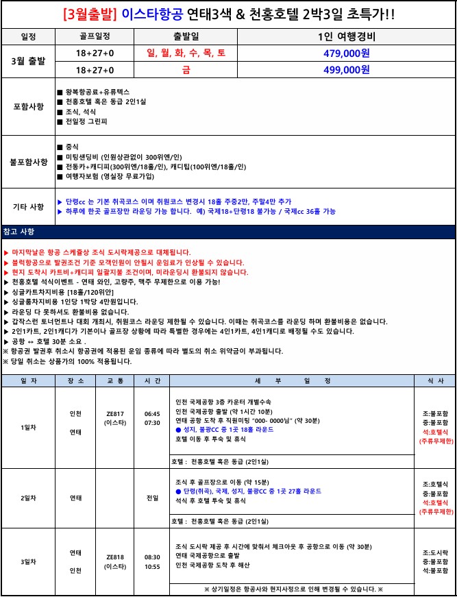 [연태] 3월~4월 이스타항공 조조패턴 - 호텔디너 주류무제한 포함 / 3색골프 패키지