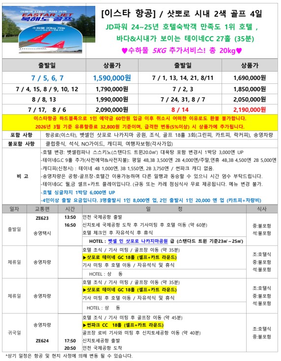 | ★ JD파워 24~25년 호텔 숙박객 만족도 1위 ★ 삿포로 현지인과 여행객에게 소문난 조식 ★ 완벽한 로케이션 - 스스키노 사거리까지 도보 8분 ★ 호텔~골프장 약 35분 소요 ★ 바다와 시내가 조망되는 테이네 G.C ★ 이스타항공 위탁수하물 +5KG 추가서비스