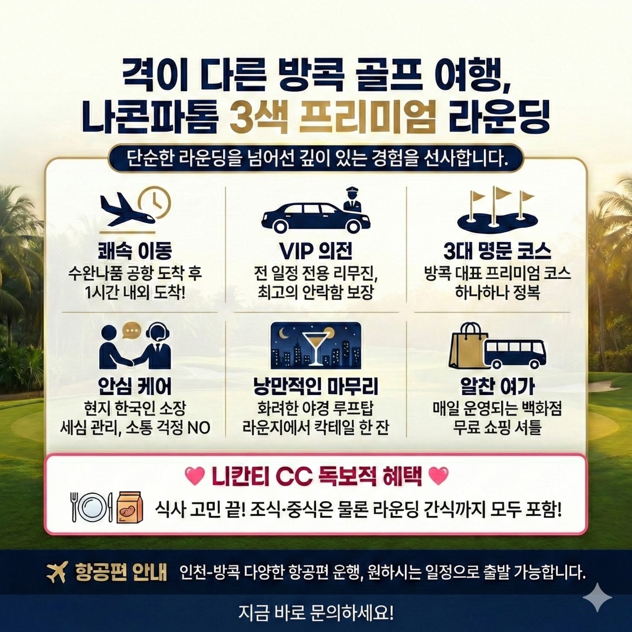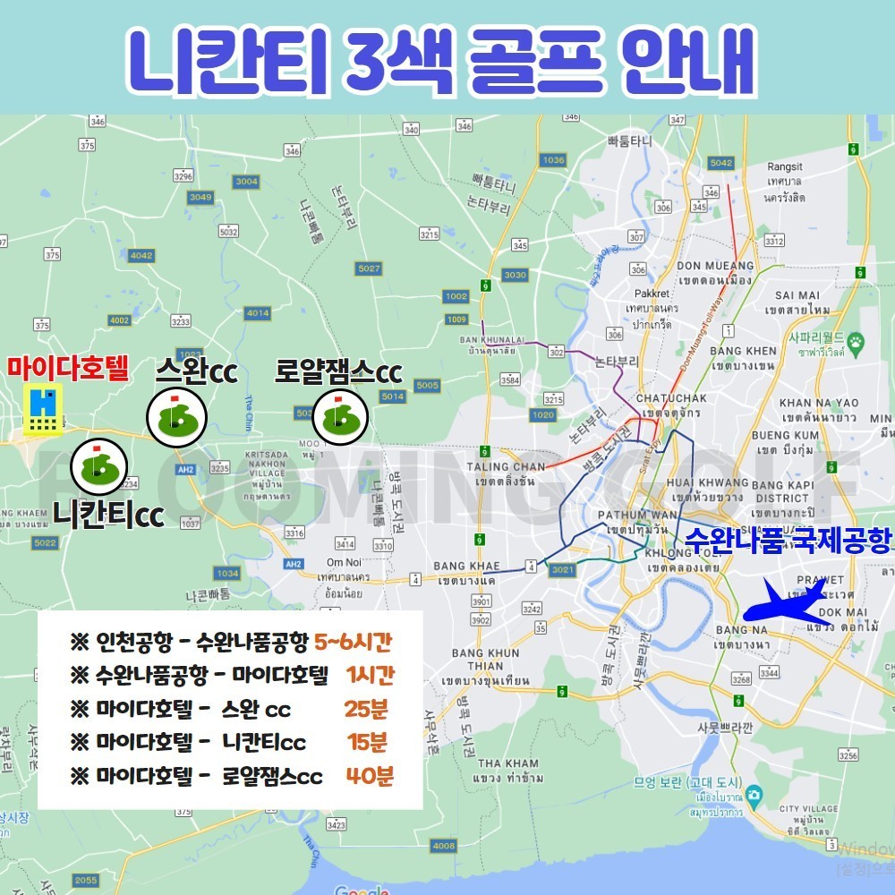 ▶ 2인 진행 시 차량은 세단이나 SUV 차량으로 진행됩니다. 3인 출발시에는 벤+가이드 차량으로 진행됩니다. ▶ 1인1카트, 1인1캐디 사용 ▶ 호텔 기준 이동거리 : 스완cc 20분, 니칸티cc 15분, 로얄잼스cc 40분 ▶ 호텔 일반실 싱글차지 (박당/ 룸당) : 5만원입니다. / 호텔 스위트룸 싱글차지 (박당/ 룸당) : 10만원입니다. ▶ 석식(중식)은 현장 상황에 따라 다른 석식으로 대체될 수 있습니다. ▶ 현지식은 <중국식: 베이징덕&딤섬>으로 진행될 예정입니다. ▶ 니칸티 2부 티업 시 석식이 포함됩니다. (석식 : 니칸티CC 석식 클럽식) ▶ 커피쿠폰은 호텔 D층(루프트탑)에 있는 카페에서 이용 가능합니다. (00 바트까지 사용가능, 추가금액은 현장지불) ▶ 마사지는 타이마사지 1시간 1회권 (인당)이며 마사지샵은 현지 사정에 따라 변동될 수 있습니다. ▶ 라운드 추가 요금: 변동사항 스완CC : 18홀 (주중 $60, 주말 $80), 9홀 (주중 $45, 주말 $65) 로얄잼스 : 18홀 (주중 $60, 주말 $95), 9홀 (주중 $45, 주말 $65) 니칸티CC : 18홀 (주중 $80, 주말 $110), 9홀 (주중 $65, 주말 $95) (카트비, 캐디피, 캐디팁은 불포함입니다.) ▶ 라운드 추가는 본 예약 시 동시에 예약해 주셔야 합니다.(한국 사전지불) ▶ 옵션은 현지 차량 운행 스케쥴에 따라 선택이 어려울 수 있습니다. ▶ 센트럴 백화점 방문 시 일정시간이 넘어가는 경우 오버차지 발생할 수 있습니다. (해당일 일정 시작 후 12시간 지난 시간부터 시간당 500바트 발생) ▶ 현지에서 한국인 또는 한국어 가능한 가이드가 안내하며 호텔에서 골프장 이동 시 같이 동행하지 않을 수 있습니다. ▶ 태국공항 의전서비스(패스트랙&카트서비스)는 예약 시 신청해 주셔야 합니다. ▶ 우천이나 천재지변으로 인하여 라운딩(추가라운딩 포함)이 불가할경우 환불(캐디피, 카트비 포함)이 진행되지 않습니다. (라운딩 불가 시 타이 마사지 1시간 서비스로 진행될 예정입니다.) ▶ 체크인 날짜 기준 3주 전 지상비 완납 조건이며 이후 취소 시 100% 패널티가 부과됩니다. ▶ 확정 티업은 출발 7일 전에 나옵니다. ▶ 출발일 기준 여권 만료일이 6개월 이상 남아 있어야 합니다. ▶ 패키지 상품이므로 라운드 및 식사, 포함된 일정을 진행하지 않아도 환불되는 금액이 없습니다. (천재지변, 우천 등도 불가) ※ 상기 일정은 항공 및 현지 사정에 의해 다소 변경될 수 있습니다. |