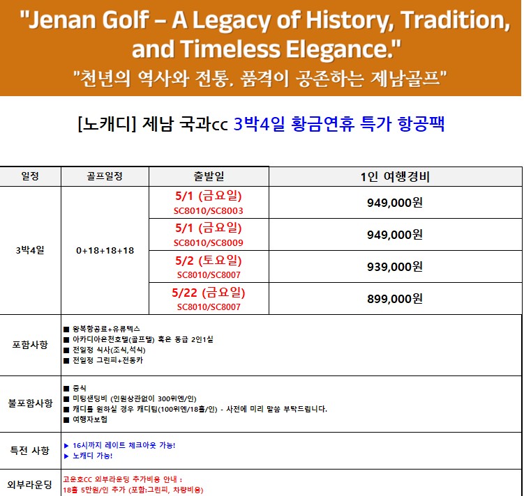 [제남] 5월 황금연휴 - 노캐디 국과국제 카트캐디피 포함 2박3일 / 3박4일