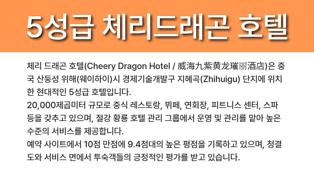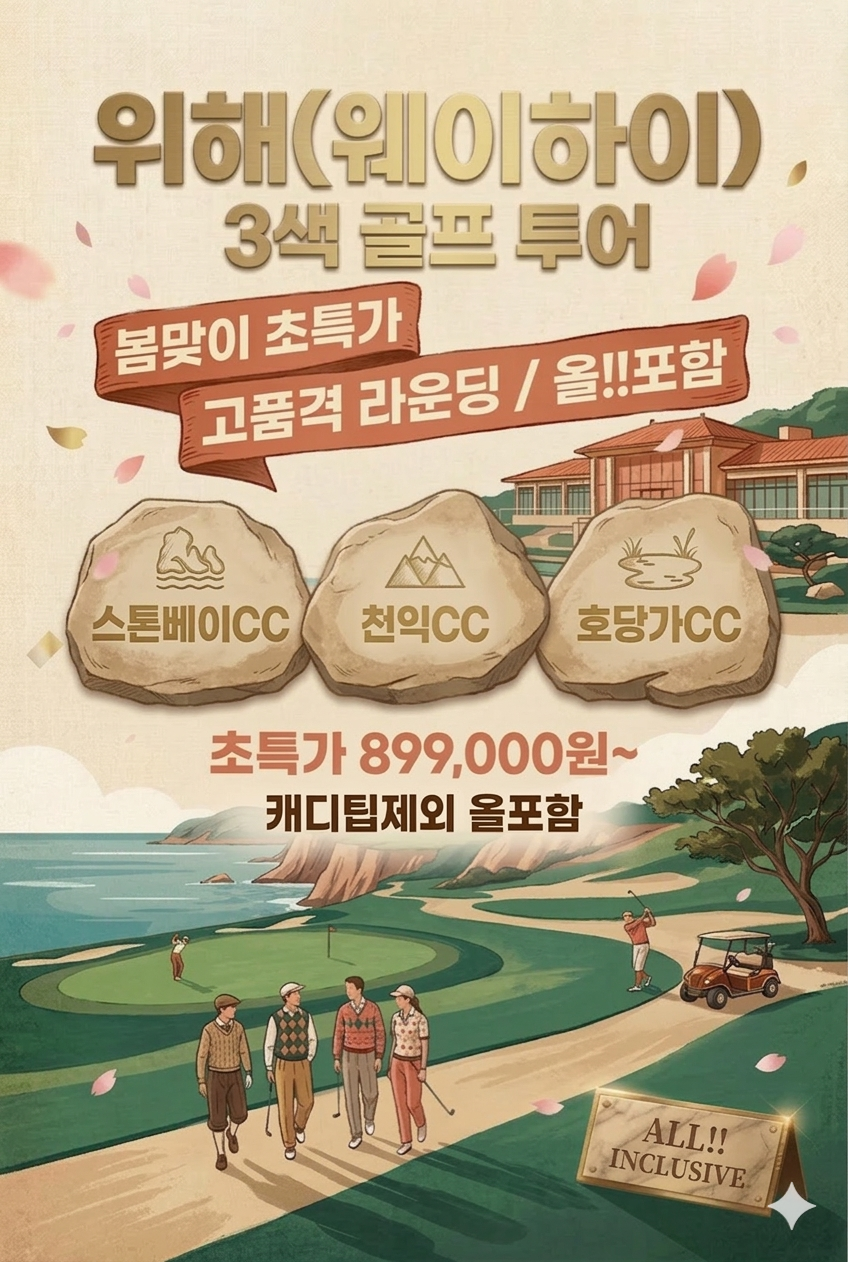 | ✈️ 항공 | 제주항공(15kg,기내10kg) 출발편 [7C8501] 10:30 - 10:50 리턴편 [7C8502] 11:50 - 14:00 | ⭕ 포함사항 | 왕복항공권 채리드래곤 호텔 5성급 2인1실 (초특급) 조/중식/석식 골프(그린피, 카트비, 캐디피, 라커) 미팅샌딩비 여행자보험 | ❌ 불포함사항 | 캐디팁(100위안/18홀/인)