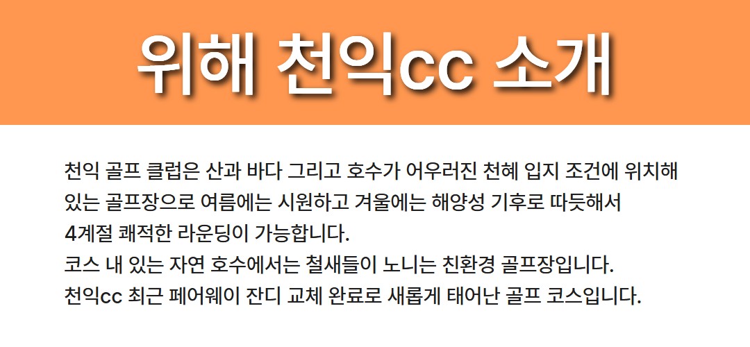 | 🚩 기타안내 | 호텔 싱글룸 차지는 비수기5만/박/인, 성수기 8만/박/인 우천,번개 등 천지지변으로 라운딩을 못하더라도 환불불가 식사(조식/중식/석식) 미 이용시 환불불가 카트나 캐디는 상황에 따라 1:2 혹 1:4 9홀 추가시 천익 호당가 평일 50,000원 주말 60,000원 스톤베이 평일 6만원 주말 8만원입니다.(그린피+카트+캐디피) ------ 4월 BIPcc 변경 시 평일6만/주말8만 (인/18홀) 4월 포인트cc 변경 시 평일11만/주말12만(인/18홀)