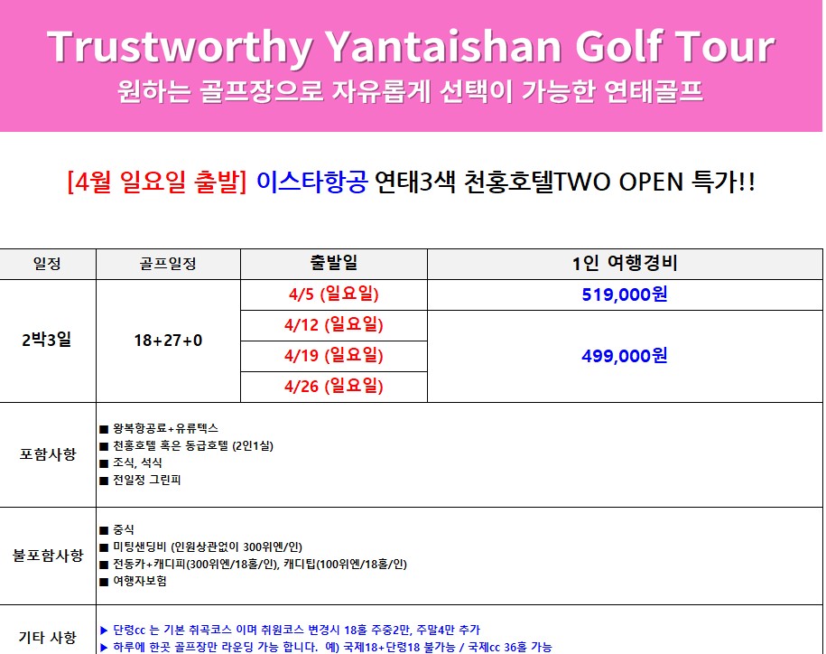 [연태] 4월 일요일 출발 2박3일 패키지 - 호텔디너 주류무제한 포함