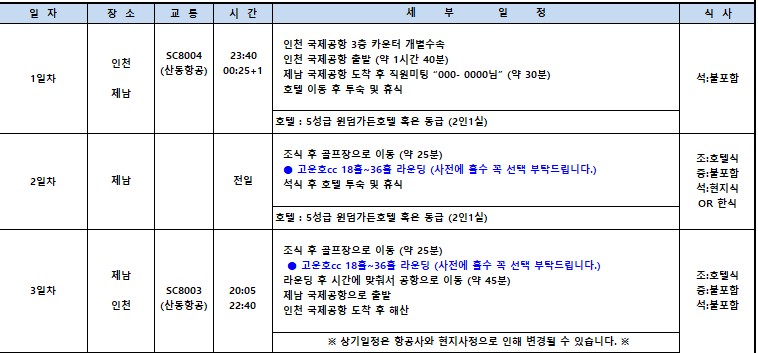 ▶ 사전에 홀수 선택 꼭 부탁드립니다. 현지에서는 변경이 안됩니다. ▶ 현지 도착시 카트비+캐디피 일괄지불 조건이며, 미라운딩시 환불되지 않습니다. ▶ 현지 9홀추가비용 인당 주중 350위엔 / 주말 400위엔 입니다. (포함:그린피,캐디피,전동카) ▶ 싱글카트 이용시 18홀 100元 입니다. ▶ 싱글룸 이용시 1인당 1박당 5만원입니다. (연휴기간 별도문의) ▶ 라운딩 다 못하셔도 환불비용 없습니다. ▶ 공항 ↔ 호텔 약 30분 소요 ▶ 호텔 ↔ 고운호CC 약 25분 소요 ▶ 호텔 ↔ 인상제남 관광지 시내 약 10분 소요 ※ 항공발권 후 취소시 100% 적용됩니다. ※ 당일 취소는 상품가의 100% 적용됩니다. |