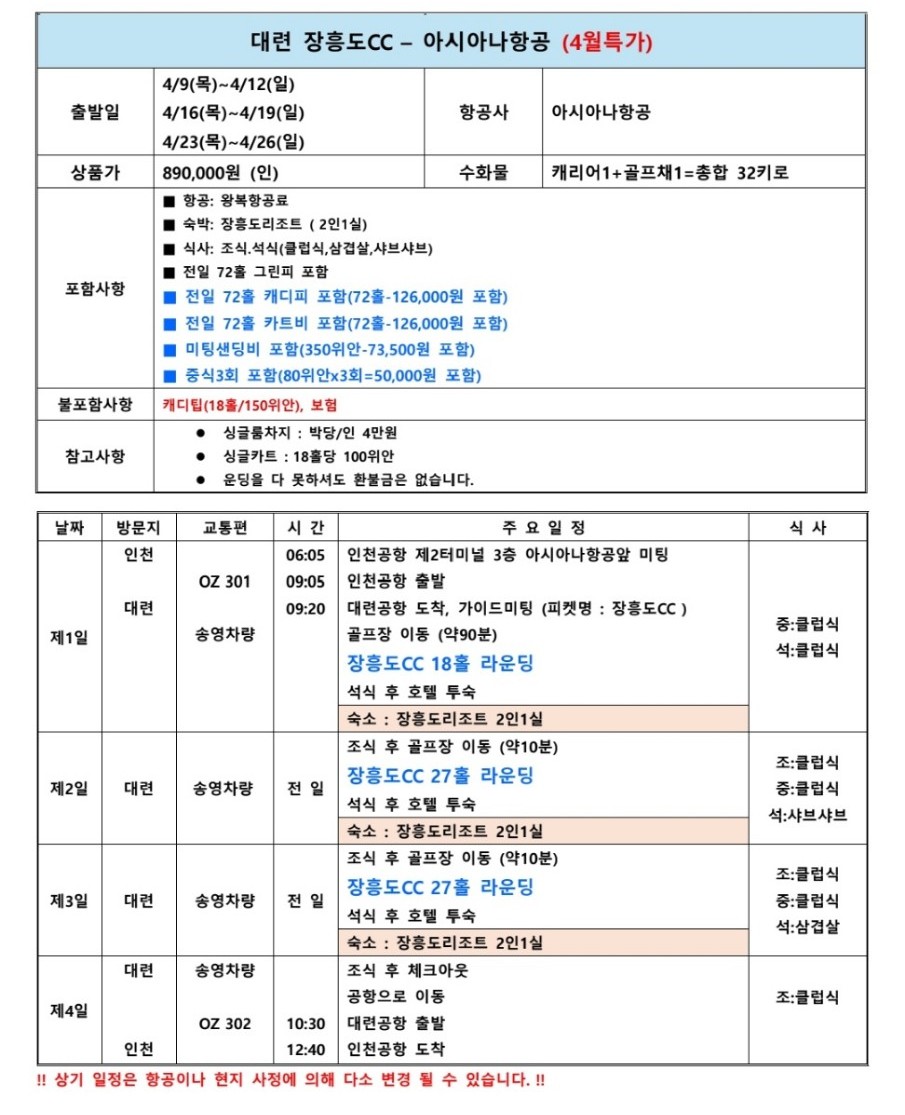 [대련] 4월 한정일 3회 캐디팁만 제외 [모두포함] 아시아나항공 3박4일 패키지