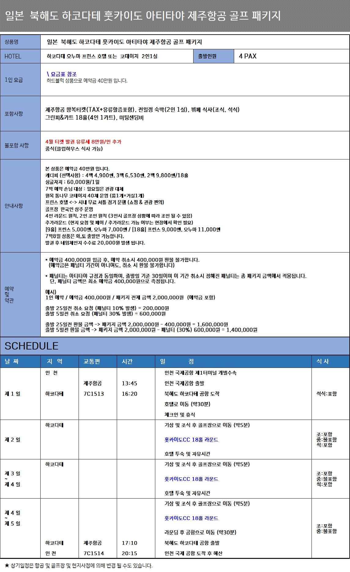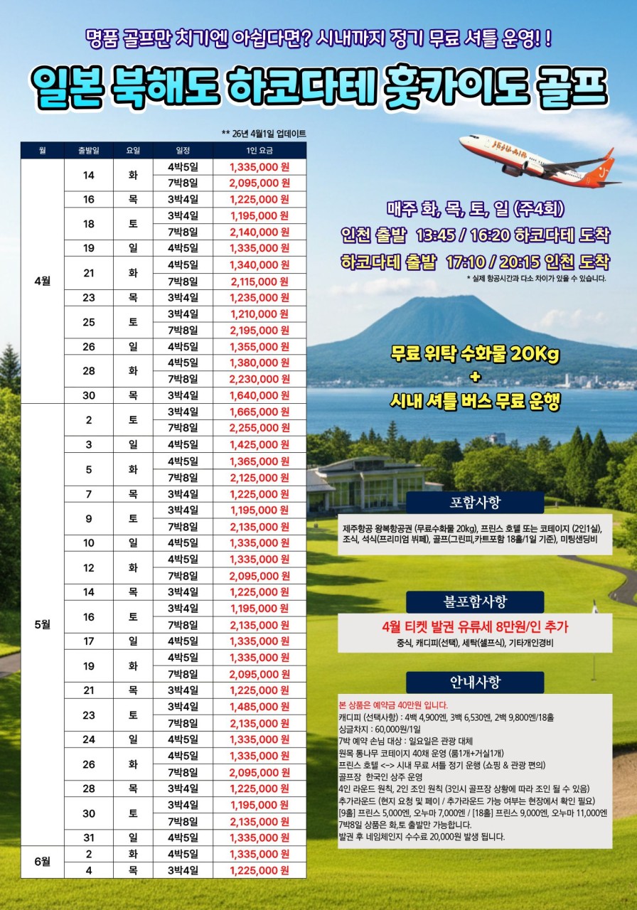 | 🧳 출발일&금액 | 5월19일 4박5일 72홀 1,335,000원 5월21일 3박4일 54홀 1,225,000원 6월/4일까지 화,목,토,일 주4회운항 마지막기회! | ✈️ 항공 | 제주항공 (수하물20KG,기내10KG) 인천출발 13:45-16:20 하코다테 출발 17:10-20:15 | ⭕ 포함사항 | · 제주항공 왕복티켓(TAX+유류할증포함) · 전일정 숙박(2인 1실) · 뷔페 식사(조식, 석식) · 그린피&카트 18홀(4인 1카트) · 미팅샌딩비