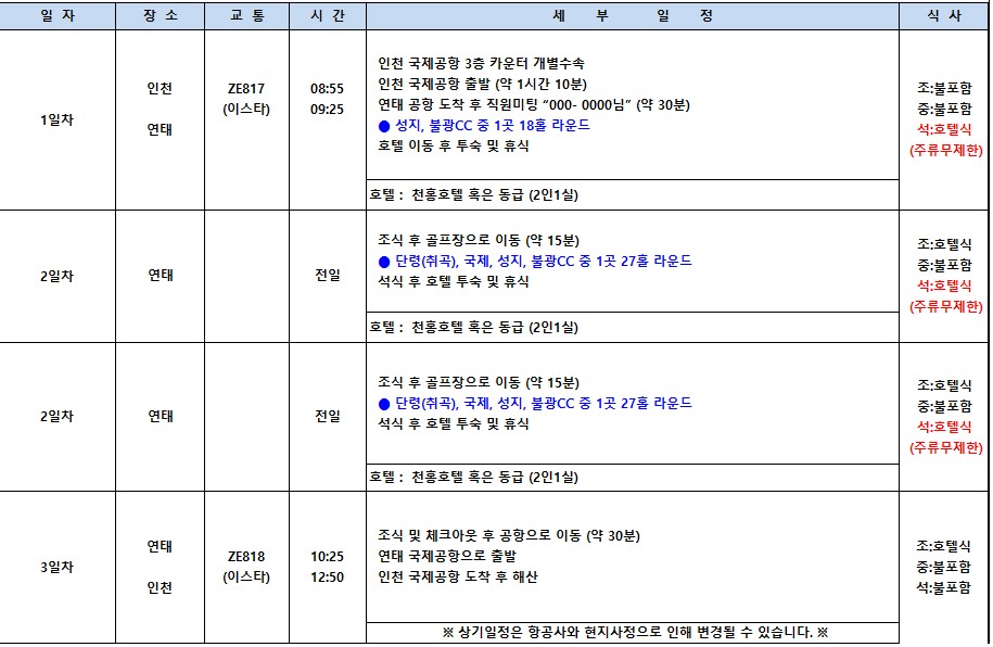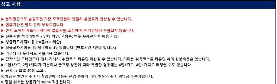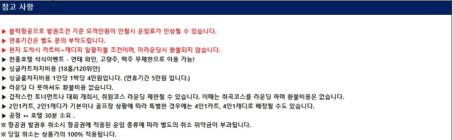 | 🚩 기타안내 | ▶ 현지 도착시 카트비+캐디피 일괄지불 조건이며, 미라운딩시 환불되지 않습니다. ▶ 남산캐슬호텔 배정 시 석식 현지식으로 진행되며 주류무제한 아닙니다. ▶ 천홍호텔 석식이벤트 - 연태 와인, 고량주, 맥주 무제한으로 이용 가능! ▶ 싱글카트차지비용 [18홀/120위안] ▶ 싱글룸차지비용 1인당 1박당 4만원입니다. ▶ 라운딩 다 못하셔도 환불비용 없습니다 ▶ 갑작스런 토너먼트나 대회 개최시, 취원코스 라운딩 제한될 수 있습니다. 이때는 취곡코스를 라운딩 하며 환불비용은 없습니다 ▶ 2인1카트, 2인1캐디가 기본이나 골프장 상황에 따라 특별한 경우에는 4인1카트, 4인1캐디로 배정될 수도 있습니다 ▶ 공항 ↔ 호텔 30분 소요.