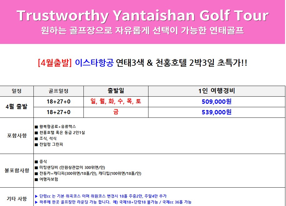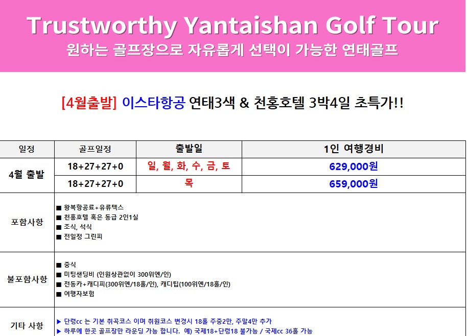 | 🧳 출발일&금액 | [4~6월 출발] 연태3색+천홍호텔 주류무제한