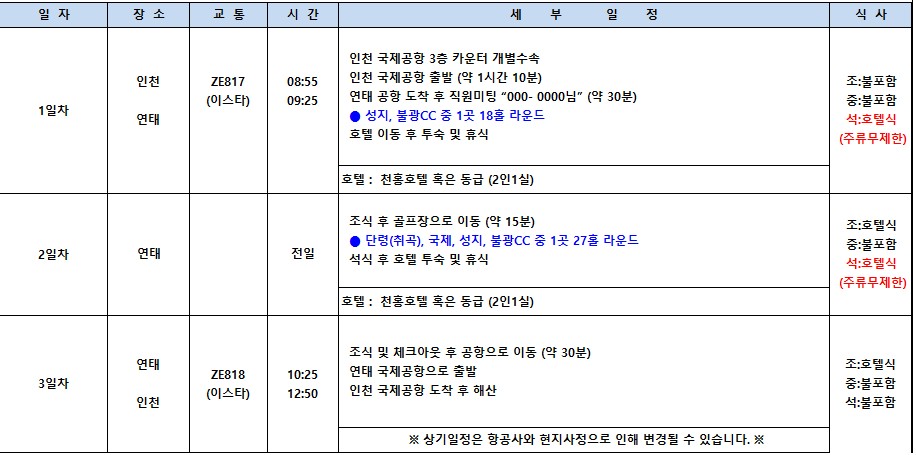 | ⭕ 포함사항 | ■ 왕복항공료+유류택스 ■ 천홍호텔 혹은 동급 2인1실 ■ 조식 (호텔뷔페) ■ 석식 (주류무제한 포함) ■ 전 일정 그린피 ■ 여행자보험