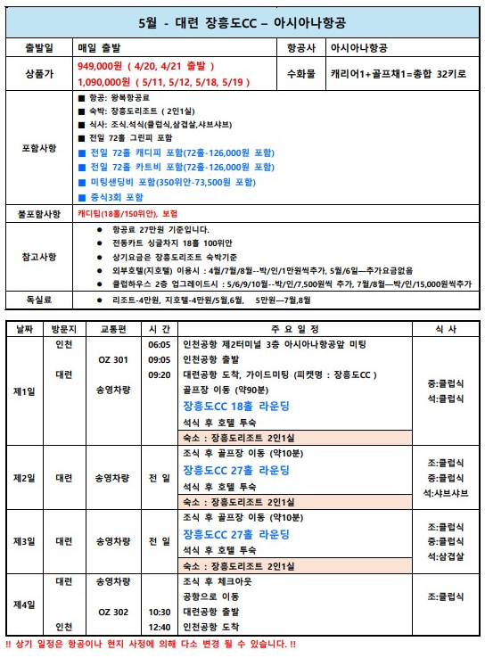 5월 11일(월) 출발 ▶ 1,090,000원 5월 12일(화) 출발 ▶ 1,090,000원 5월 18일(월) 출발 ▶ 1,090,000원 5월 19일(화) 출발 ▶ 1,090,000원