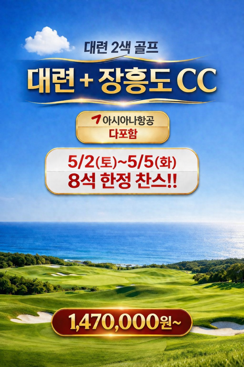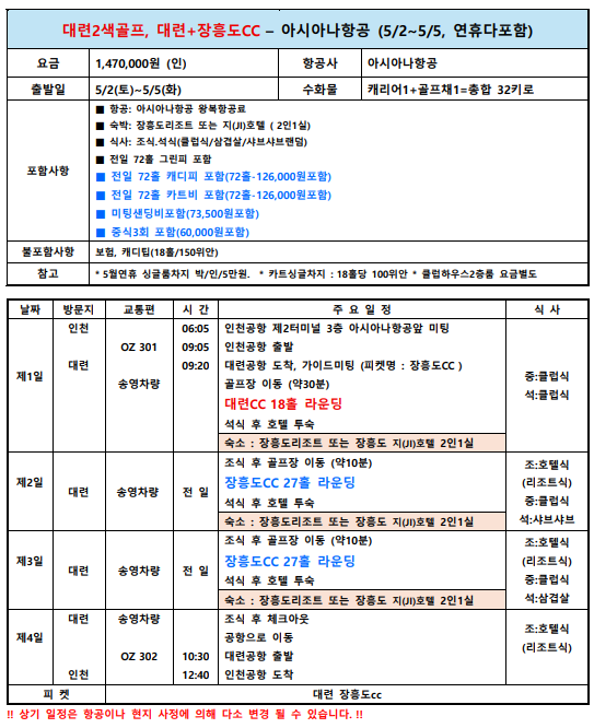 | ⭕ 포함사항 | 왕복항공권(유류/TAX) 리조트 2인1실 조식 중식 석식(클럽식/삼겹살/샤브샤브) 전 일정 그린피 전 일정 카트피 전 일정 캐디피 미팅샌딩비 여행자보험 무료가입(영실장예약)