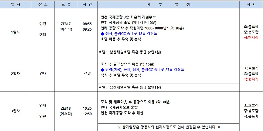 인천공항 - 연태공항 약 1시간 10분 소요 연태공항 - 남산캐슬호텔 약 35분 소요 남산캐슬호텔 - 골프장까지 약 3~5분 소요