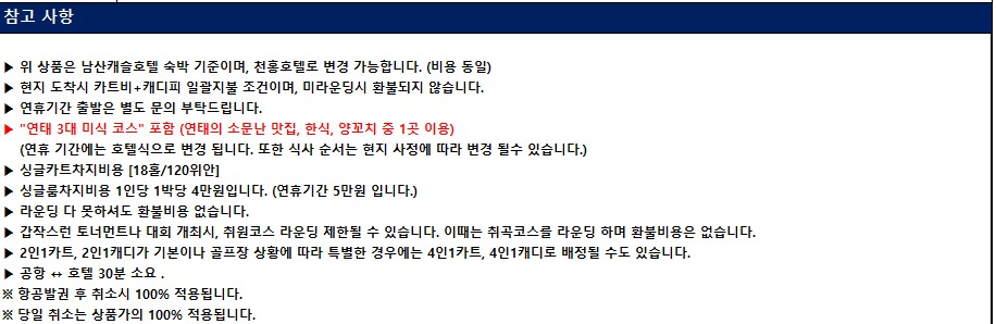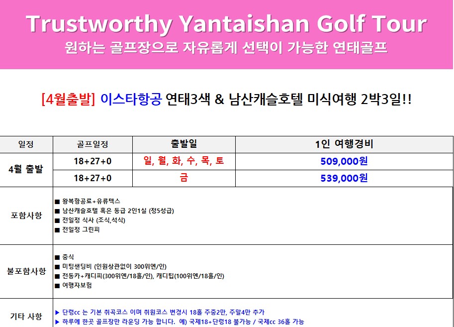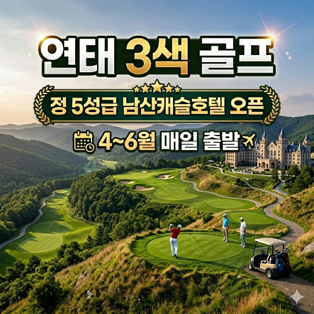 매일 다른 골프장 배정으로 다채로운 코스 경험 쾌적한 신축 '남산캐슬호텔'에서의 편안한 휴식 북경오리, 양꼬치, 한식까지 완벽하게 즐기는 연태 미식 투어 미팅/샌딩비 단 300위안! 부담을 낮춘 압도적 가성비 공항-호텔-골프장 간 이동 시간 30분 이내의 최적 동선 한국어 소통이 가능한 현지 직원 상주로 안심할 수 있는 여행 | ||||||||