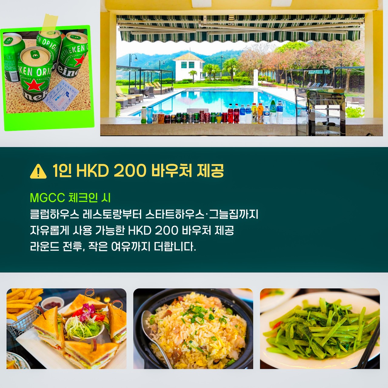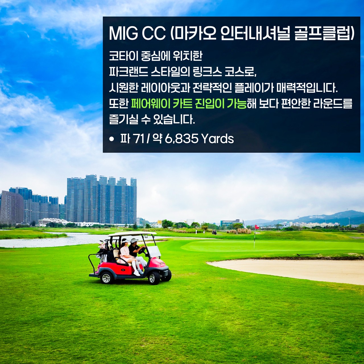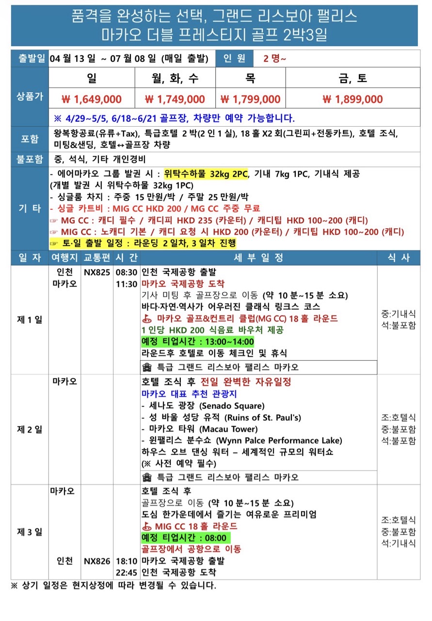 | 🚩 기타안내 | - 싱글룸 1박당 주중 15만원/주말 25만원 - 싱글카트 MIG CC HKD 200 / MG CC 주중 무료 - MG CC : 캐디필수 (캐디피 HKD 235 / 캐디팁 HKD 100~200) - MIG CC : 노캐디 기본 (캐디요청시 HKD 200 / 캐디팁 HKD 100~200) - 토/일출발 일정 : 라운딩 2일차와 3일차에 진행