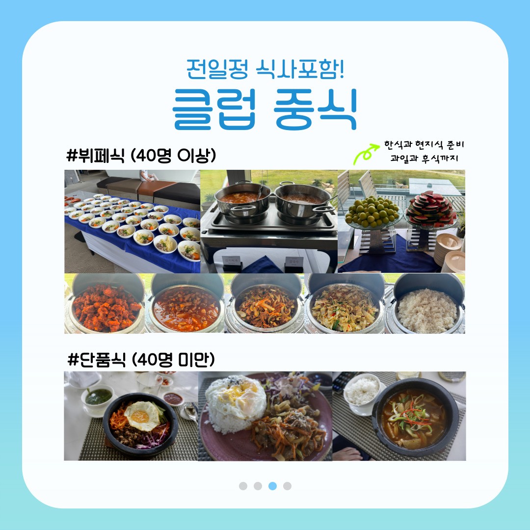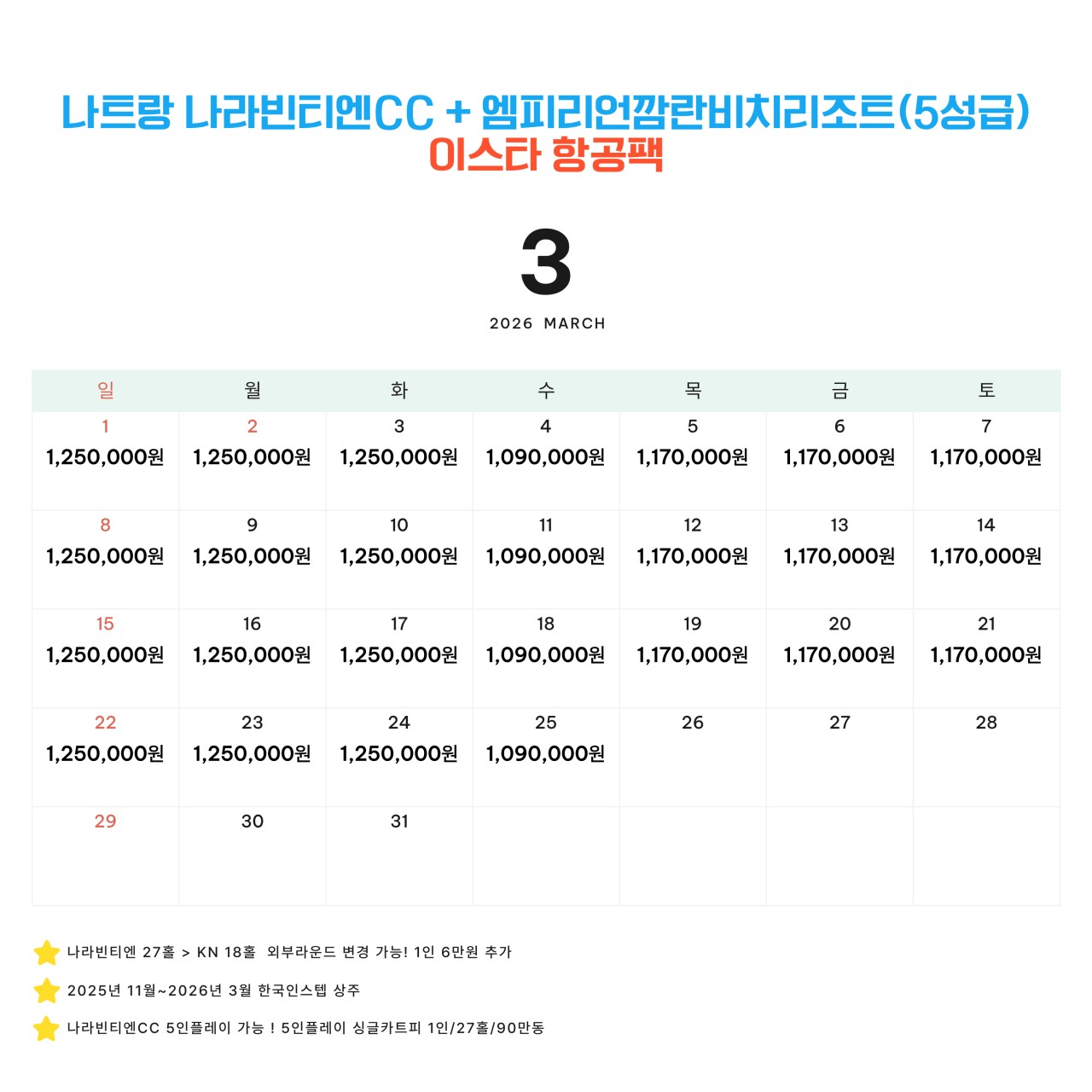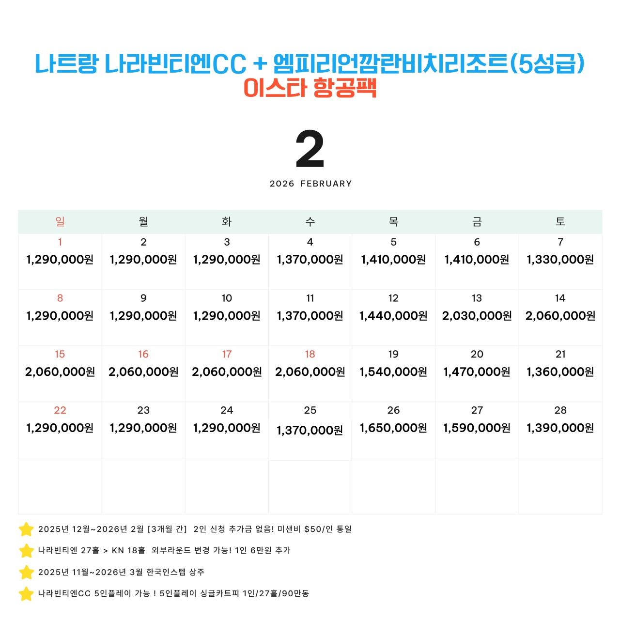 | - 2인부터 신청 - 1~2월한정 미샌비 인원상관없이 1인 50$ - 불포함: 미샌비, 카트+캐디피, 캐디팁 - 3인신청추가금없음(엑베사용) - 나라빈티엔한정 5인플가능(카트피추가) - 매일 스페셜석식 포함 / 나트랑 시내관광 포함