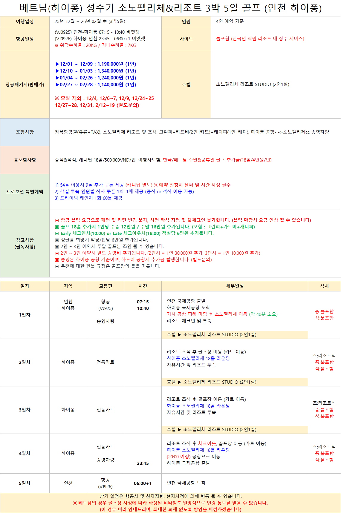 | 🚩 기타안내 | - 골프 9홀 또는 18홀 추가 가능합니다. (추가금 별도 문의) - 리조트 얼리 체크인 또는 레이크 체크아웃 가능합니다. (추가금 별도 문의) - 2인 ~ 3인 예약시 주말 골프는 조인 될 수 있습니다. - 2인 ~ 3인 예약시 별도 송영비 추가됩니다. - 송영은 하이퐁 공항 기준이며, 하노이 공항시 추가금 발생합니다. (별도 문의) - 우천에 대한 환불 규정은 골프장의 룰을 따릅니다.
