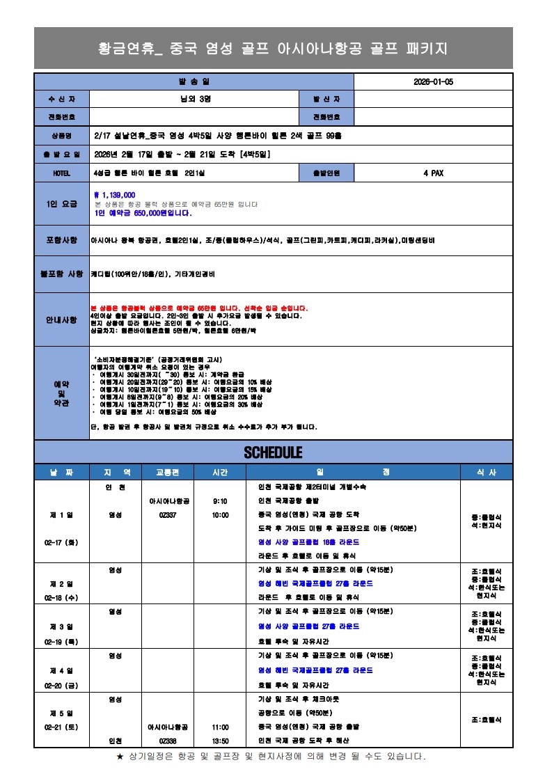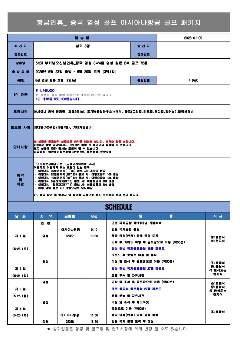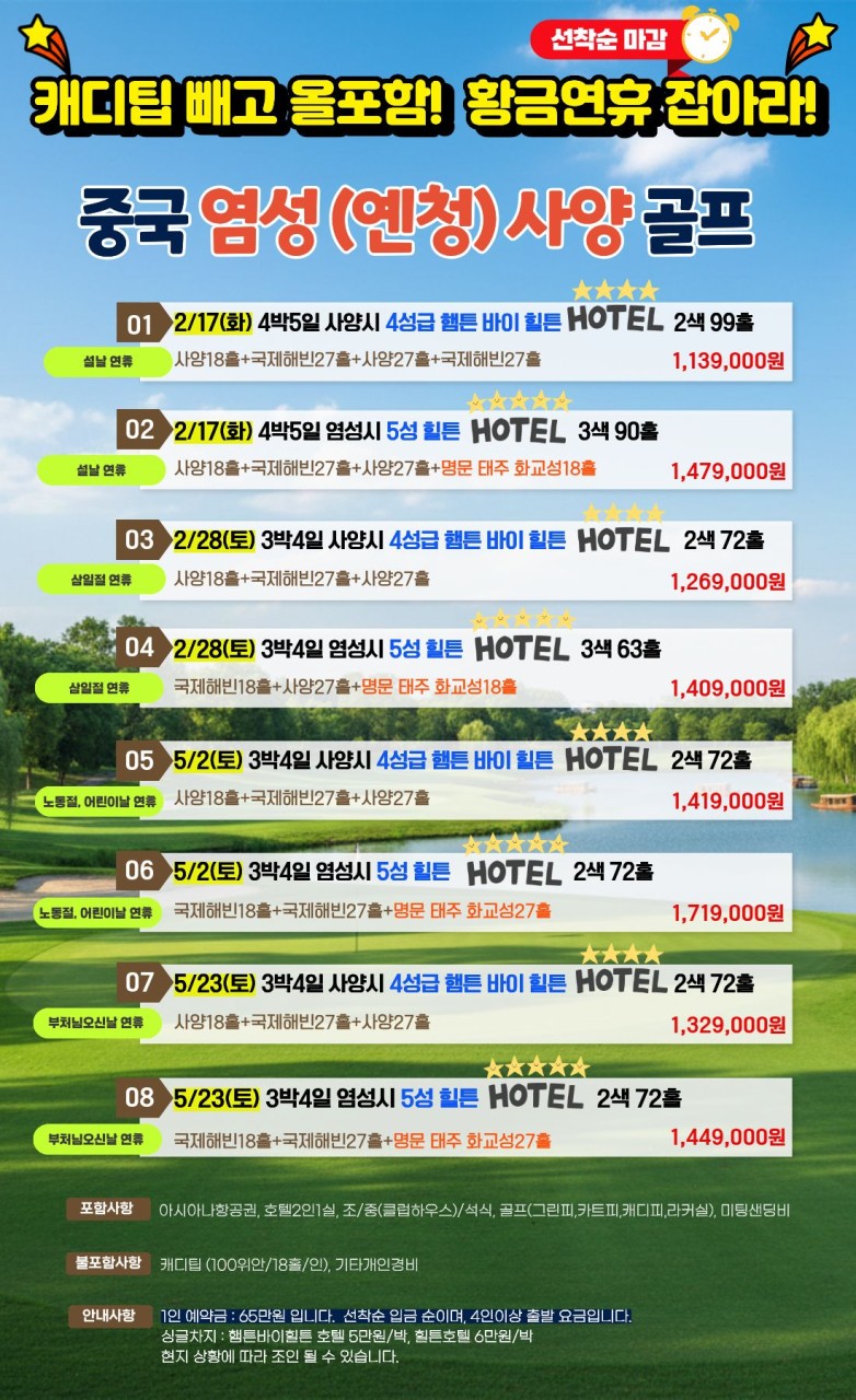 [염성 황금연휴] 팁 빼고 모두포함 패키지 - 아시아나항공 왕복탑승