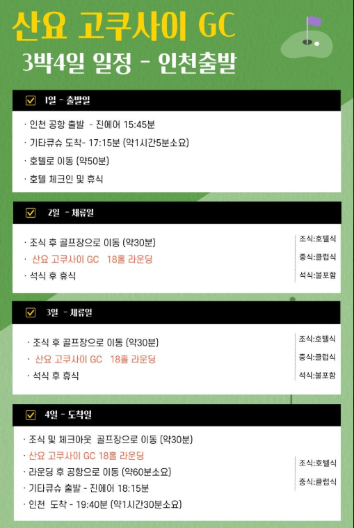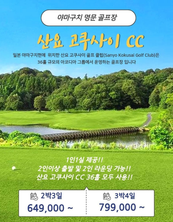 ![]() ★ 한국에서 1시간여 비행거리 !! ★ 싱글룸 무료제공(1인/1실) ★ 라운딩 후에도 즐거운 시내 중심 체류형 골프투어! ★ 다양한 맛집 투어와 백화점 쇼핑도 가능 ※ 본 상품은 실시간 항공요금이 반영되는 상품으로, 예약 시점에 따라 상품가 변동이 발생할 수 있는 점 양해 부탁드립니다 | ||||||
