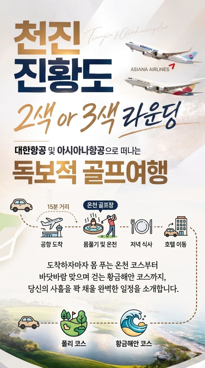 옛 중국 황제들이 불로초를 찾아 나섰다는 전설의 땅 "진황도" 봄바람이 다가오는 "진황도"에서 전략과 코스의 재미로 가득찬 "폴리cc"와 코스 전체가 푸른 바다와 맞닿은 "황금해안cc" 국적기(대한/아시아나항공) 왕복항공권포함 72홀 ALL포함 라운딩 2인부터 출발 가능
